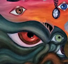 The human is deformed due to his own fear and anxiety, he feels all the eyes staring at him, he senses the monsters on his sides, that are about to eat or strangle him. The background can be seen through his eyes and mouth, as if his presence is about to dissolve.